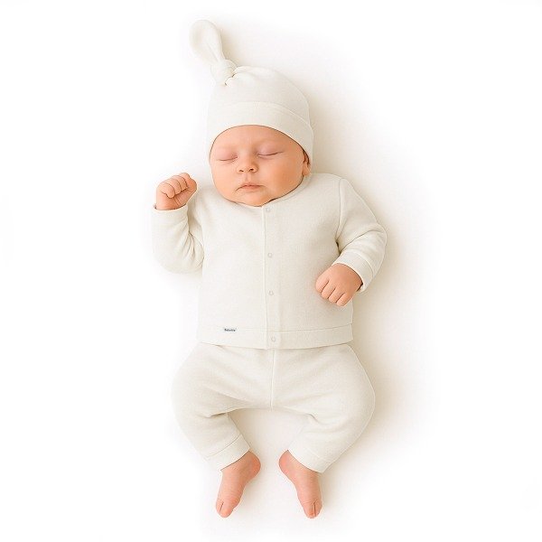 Saquito con broches metálicos, pantalón y gorrito con nudo.