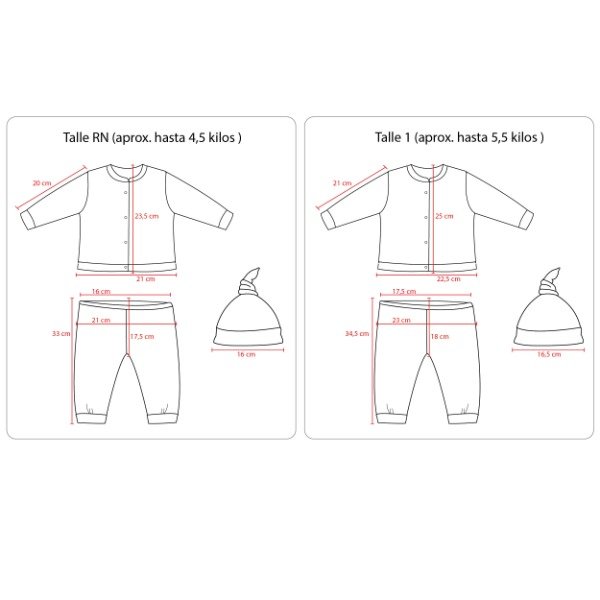 Talle 0 (RN hasta 4,5 kilos) y T1 (hasta 5,5 kilos)